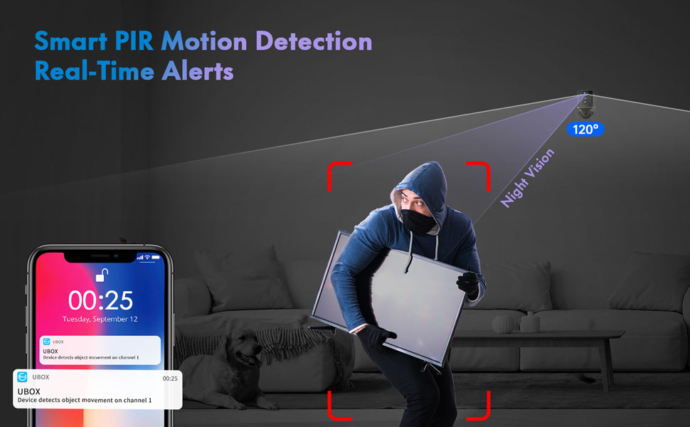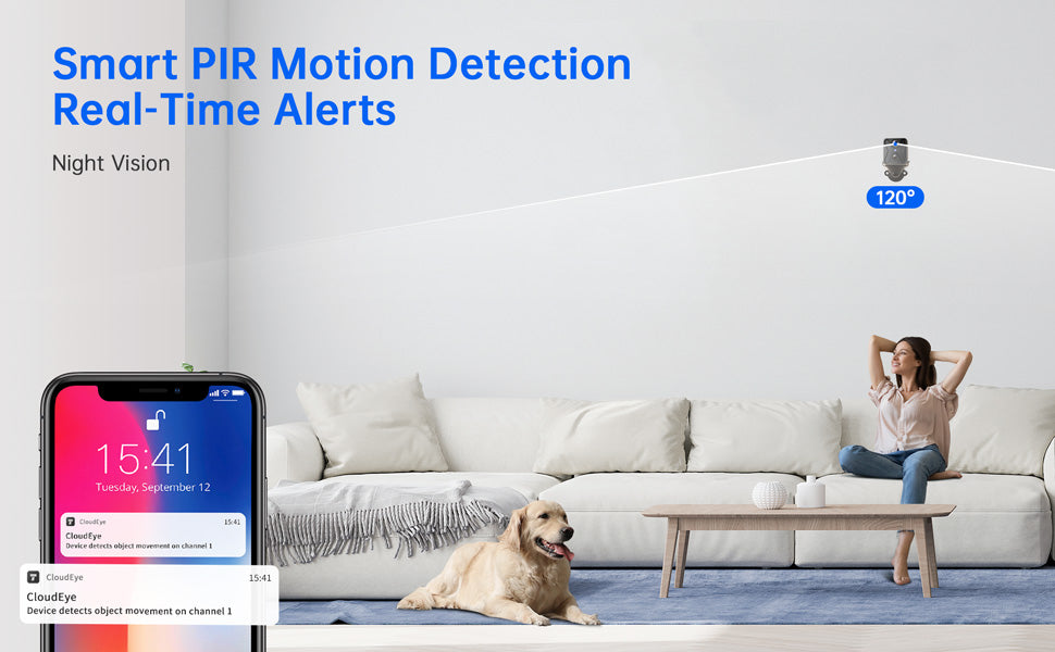 - The intelligent PIR sensor with distance up to 16 feet can capture any slight movement of human, real-time alerts will send to you through the phone APP & record and save the video immediately. Plus 120° wide angle, you won’t miss any important events even you leave the camera unattended.