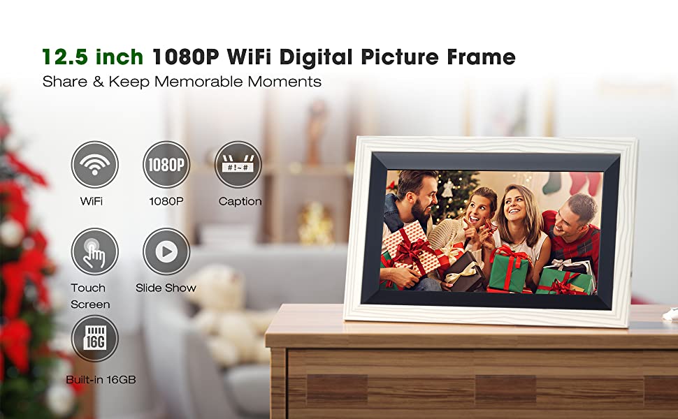 The upgraded 12.5'' 1080P smart digital picture frame brings you a better viewing experience. With pictures and videos displaying on the IPS high-definition screen, you can enjoy beautiful colors from any angle