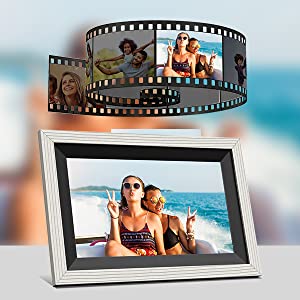 - Built in Large Storage - The picture frame provides a built-in 16GB memory, storing over 40,000 photos of 300kb/pc in the frame. The smart digital picture frame has a very user-friendly operation system, the pictures and videos can be auto-rotated when displaying, portrait, or landscape, place it as you like.